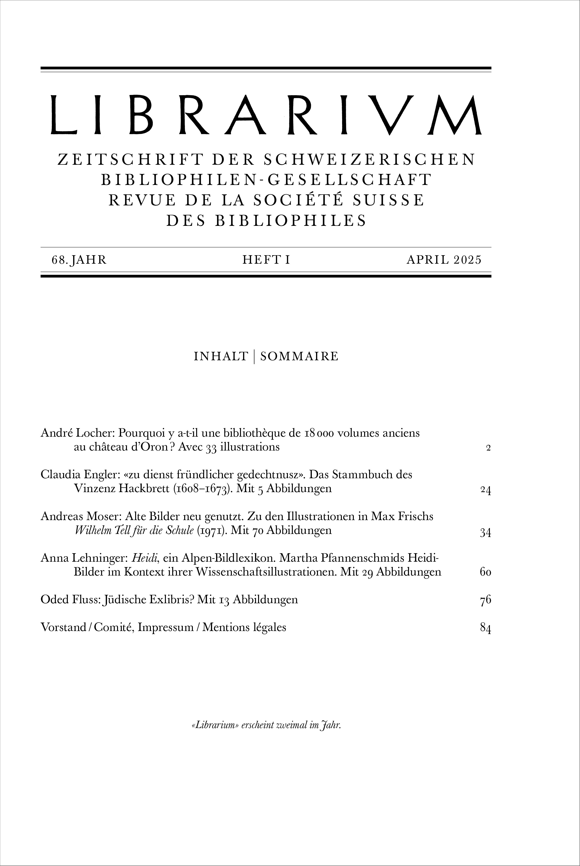 «Librarium» - die Zeitschrift der Schweizerischen Bibliophilen-Gesellschaft - erscheint zweimal im Jahr. Hier finden Sie jeweils die Inhaltsseite des zuletzt erschienenen Hefts.